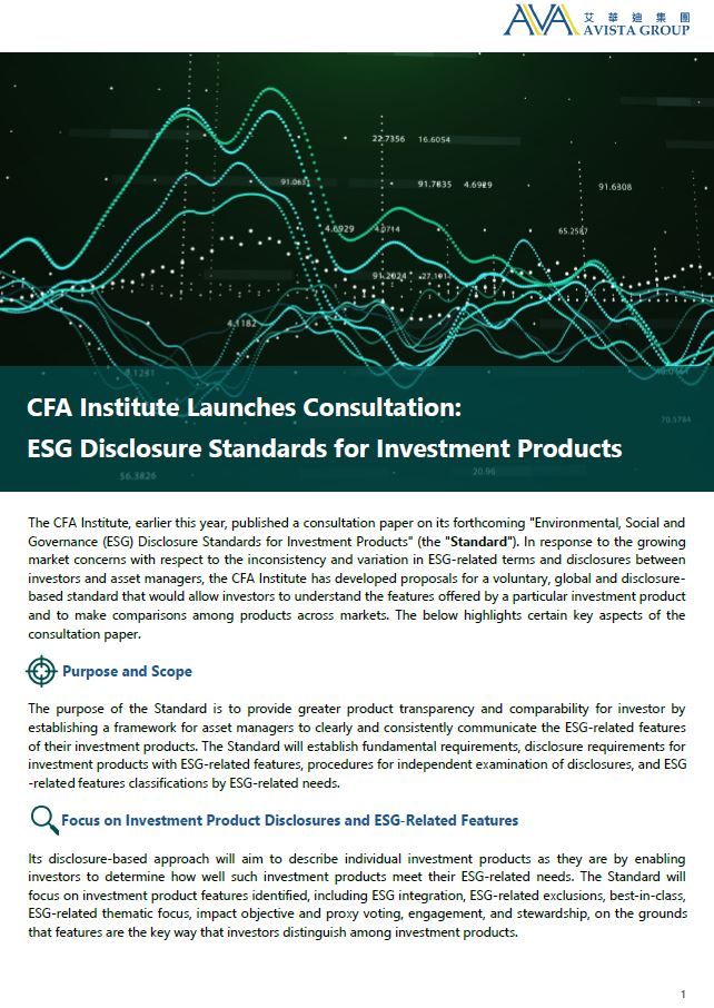 The CFA Institute has previously published a consultation paper on its forthcoming "Environmental, Social and Governance (ESG) Disclosure Standards for Investment Products". In response to the growing market concerns with respect to the inconsistency and variation in ESG-related terms and disclosures between investors and asset managers, the CFA Institute has developed proposals for a voluntary, global and disclosure-based standard that would allow investors to understand the features offered by a particular investment product and to make comparisons among products across markets.